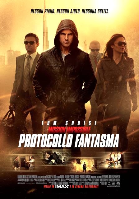 Il quarto capitolo della serie sul grande schermo ci consegna un Ethan Hunt più umano del solito. Stavolta ha bisogno di una squadra che lo aiuti, anche se gran parte del lavoro "impossibile" lo fa come al solito lui. Singoli con problemi passati e che diventeranno TEAM coeso grazie a Ethan. Una squadra da ringraziare alla fine, da beverci su una birra e con la quale fare affidamento per inevitabili future MISSION della ormai consolidata serie. Ethan è rinchiuso in un carcere di massima sicurezza quando Benji, esperto di software e promosso ad azioni sul campo dalla IMF, prende possesso del sistema informatico della prigione aprendo le porte dei detenuti e chiudendo quelle dei secondini. Per Ethan fuggire è un gioco da ragazzi anche perché la brillante Jane sta facendo saltare le sottostanti fogne dopo aver aperto un varco per consentire a Ethan di raggiungerla. Stavolta c'è in ballo una minaccia nucleare rappresentata da un misterioso individuo con nome in codice Cobalt che considera una guerra nucleare controllata come rimedio alle condizioni dell'umanità che trarrebbe poi vantaggio e nuova spinta solidale dalla ricostruzione. Bisogna trovare i codici di accesso ai missili prima che il terrorista se ne impossessi e sono custoditi nell'inaccessibile Cremlino. Per i nostri non è difficile entrare quanto piuttosto constatare che sono già stati trafugati e che per sviare le indagini è stato fatto esplodere gran parte dell'edificio. Le autorità incolpano gli americani e tra i due paesi aumentano le tensioni tanto da far attivare al Presidente USA il cosiddetto "Protocollo Fantasma", ovvero la messa al bando dell'IMF e dei suoi agenti considerati terroristi e quindi senza più aiuti e copertura oltre ad essere attivamente ricercati dai servizi dei due paesi. Ethan e i suoi, ai quali si è aggiunto William Brandt, il bravo Jeremy Renner di The Hurt Locker, dovranno dimostrare la propria innocenza e salvare il mondo dalla catastrofe. Dalle arrampicate mozzafiato sul grattacielo più alto del mondo, il Burj al Khalifa di Dubai all'esotica e pericolosa Mumbai in India i nostri tra mille insidie e pericoli riescono a scongiurare il peggio e il missile già lanciato e che avrebbe significato una chiara ritorsione russa all' attentato del Cremlino, viene disattivato poco prima dell'impatto di "sguincio" contro la sommità del Pyramid Tower di San Francisco. Si parlerà di meteorite e tutto finirà nel migliore dei modi. Il terrorista ucciso e le autorità russe soddisfatte dalle prove acquisite nella missione dei nostri, che reintegrati in servizio hanno finalmente modo di godersi una birretta complimentandosi per il lavoro di squadra e in attesa di una nuova MISSION IMPOSSIBLE.
